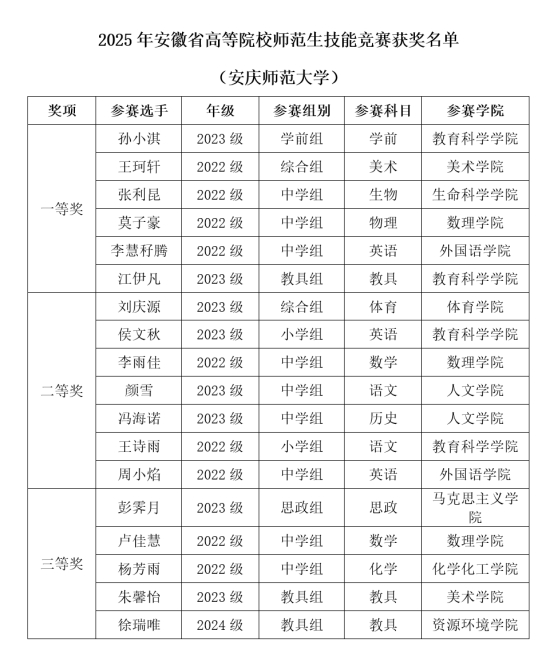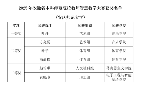 10月31日至11月2日,2025年安徽省高等院校师范生教学技能竞赛暨安徽省本科师范院校教师智慧教学大赛在合肥师范学院举办。今年会师生在此次大赛中再创佳绩,共斩获一等奖7项、二等奖10项、三等奖7项的优异成绩,其中教师组获一等奖1项、二等奖3项、三等奖2项,学生组获一等奖6项、二等奖7项、三等奖5项。