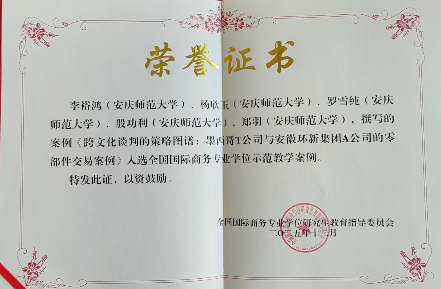 12月13日,由全国国际商务专业学位研究生教育指导委员会主办的“2025全国国际商务示范教学案例总结会暨第三届国际商务教学案例开发与应用研讨会”在北京召开。会上公布了第三届全国国际商务示范教学案例入选名单,今年会经济与管理学院副教授李裕鸿主持开发的《跨文化谈判的策略图谱:墨西哥T公司与安徽环新集团A公司汽车零部件交易案例》成功入选“全国国际商务专业学位示范教学案例”。