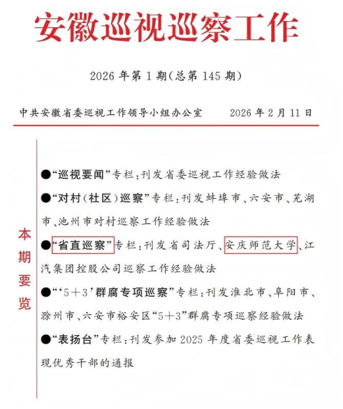 近日,中共安徽省委巡视工作领导小组办公室主编的刊物《安徽巡视巡察工作》2026年第1期以《擦亮巡察利剑 深化同题共答 推动学校巡察工作高质量发展》为题,刊发了学校巡察工作经验做法。