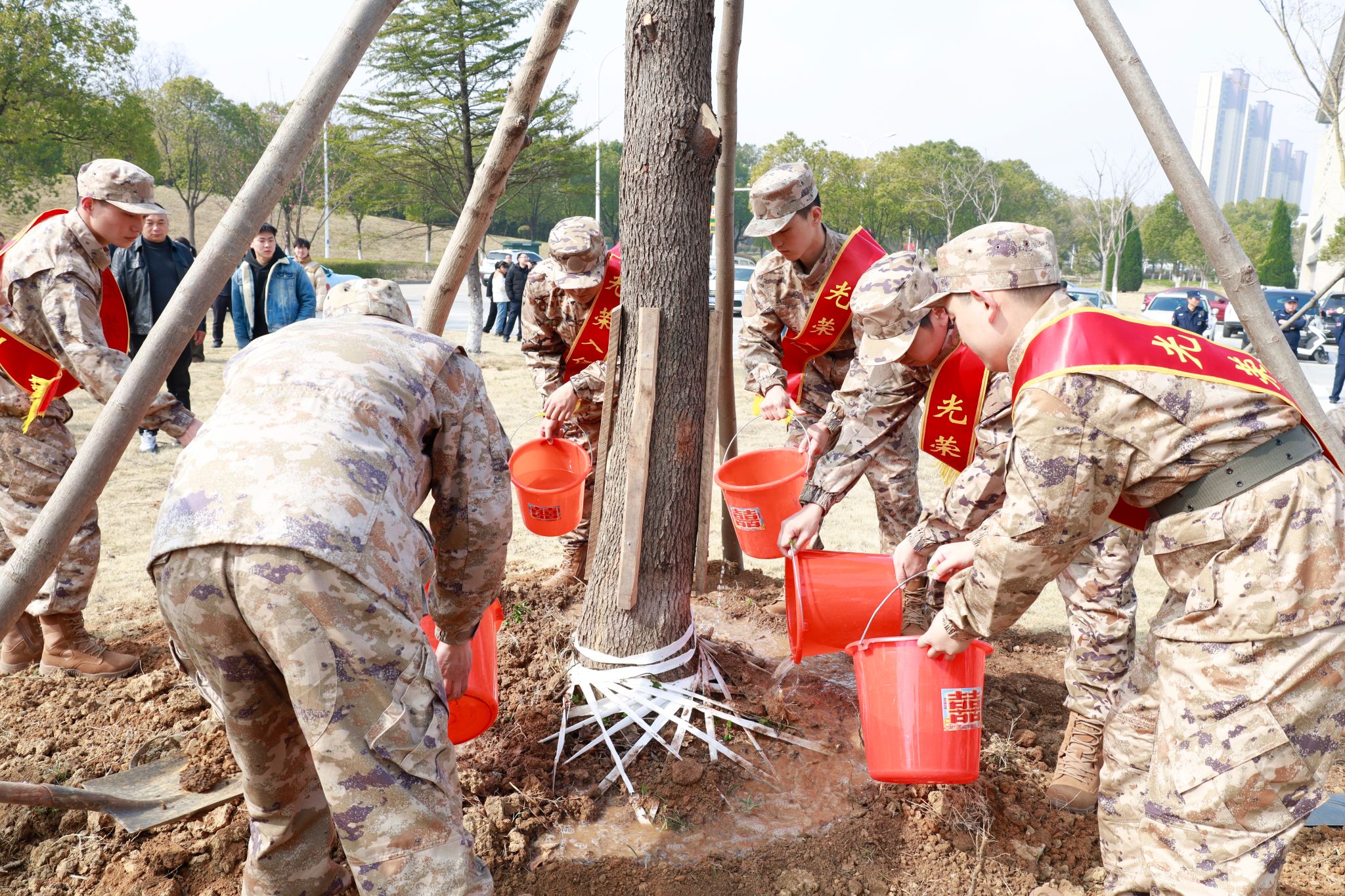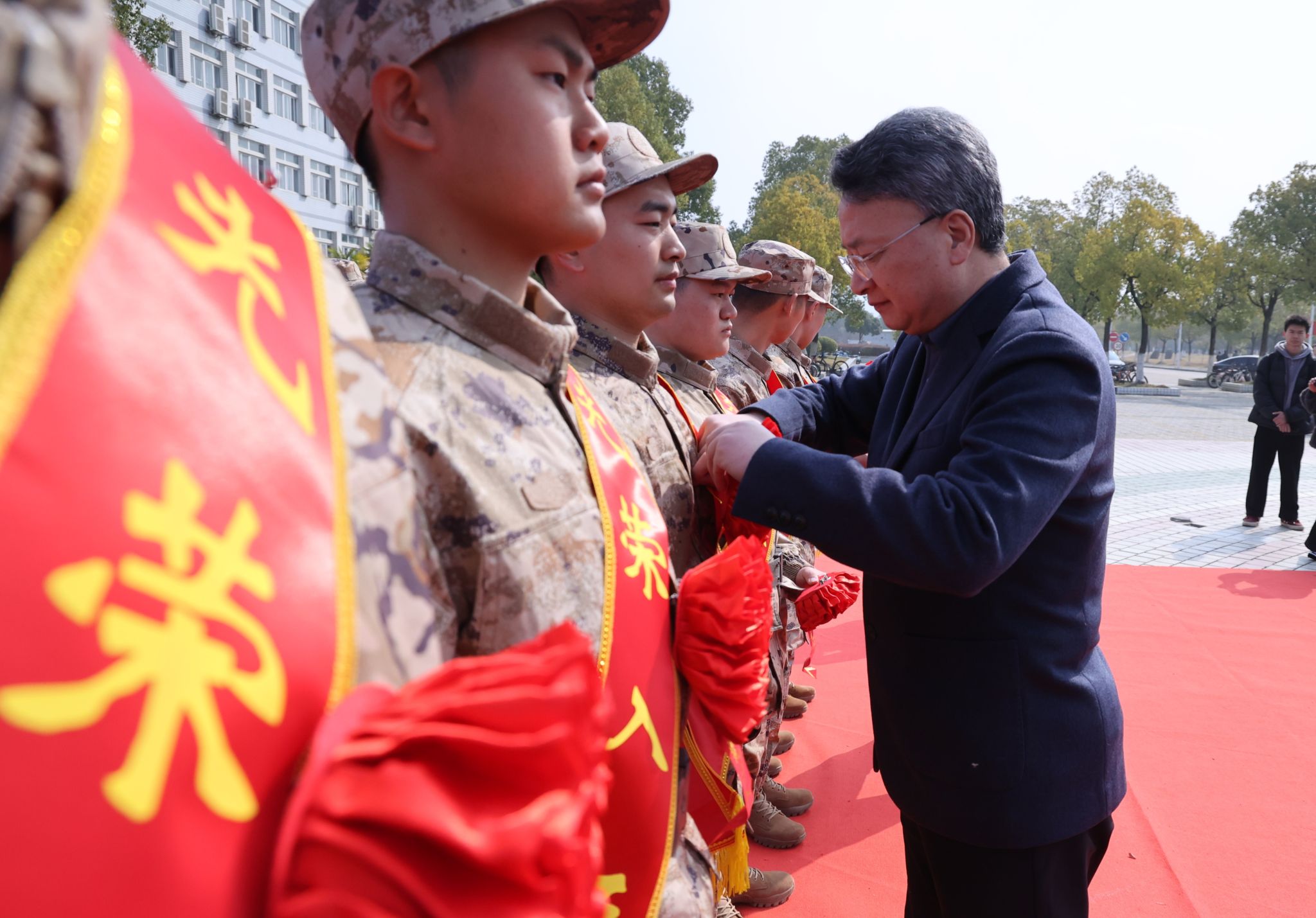 校党委书记李福华等党政领导参加“强军林”植树,并为2026年春季入伍大学生佩戴光荣花。李福华一边植树培土,一边与入伍大学生亲切交谈,询问他们的入伍准备和未来规划,鼓励他们在强军实践中淬炼成钢、茁壮成长。全体入伍大学生身着迷彩服,精神抖擞,挥锹铲土、扶苗浇水,在“强军林”种下一棵棵象征成长与担当的树苗。校国旗护卫队分列道路两侧,以庄严的举枪礼向新兵致敬,军车缓缓驰离校园,家长们纷纷举起手机记录下这难忘瞬间,眼中满是骄傲与不舍。