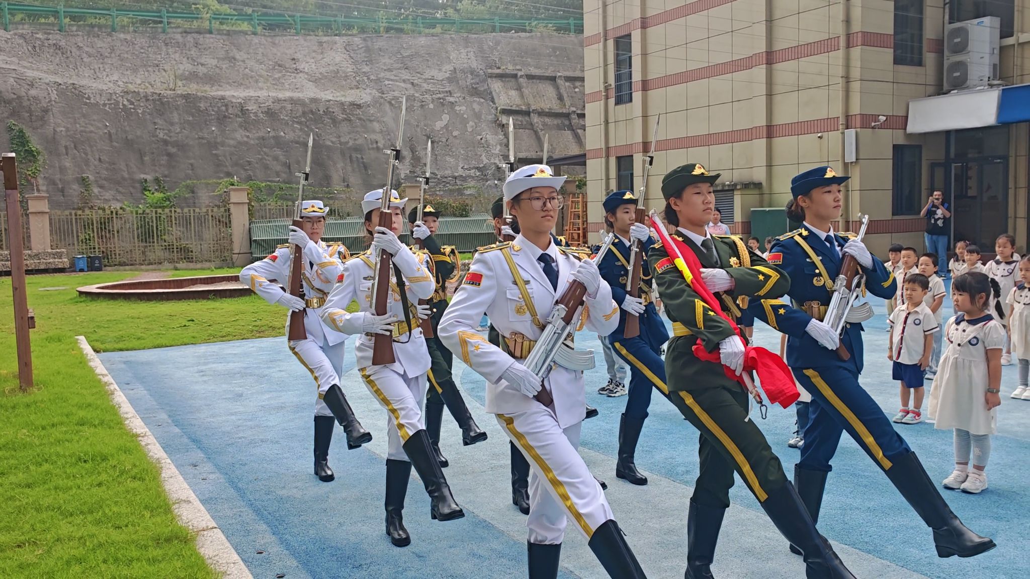 升旗仪式后,国旗护卫队的大学生们化身“小导师”,走入孩子们中间。他们用浅显易懂的语言讲解国旗的象征意义,手把手指导孩子们规范握旗、摆臂。孩子们学得专注认真,在互动体验中,对国旗的尊重与对祖国的自豪感油然而生。