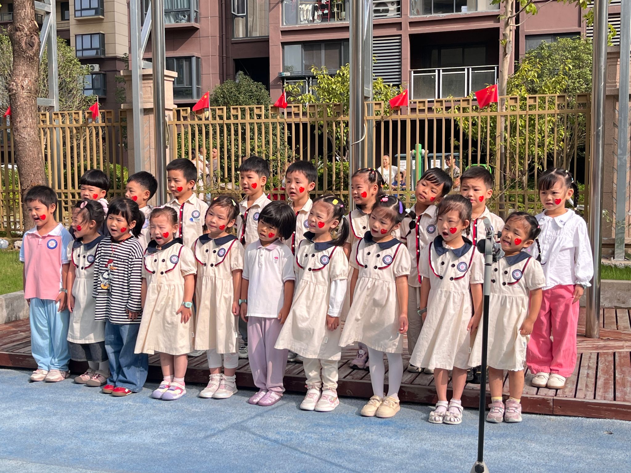 随后,中班组小朋友温情献唱《国家》。“家是最小国,国是千万家”,清澈纯真的歌声感染了在场师生,热烈掌声成为对孩子们真挚爱国情怀的最好肯定。