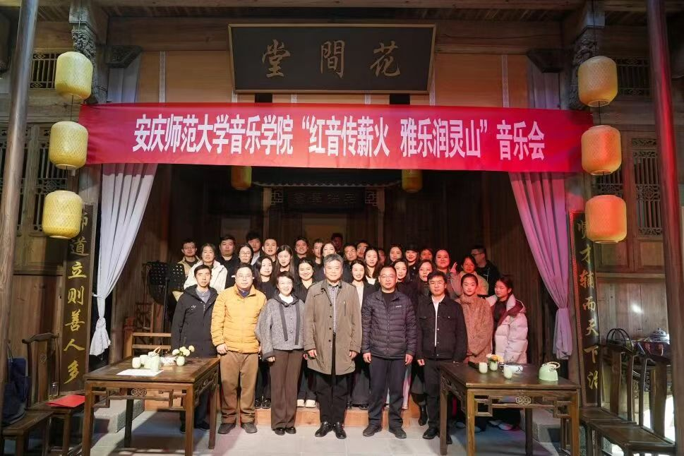 下午,全体教师赴徽州区大灵山旅游度假区,在古韵悠然的老宅茶馆举行“红音传薪火,雅乐润灵山”校企合作座谈会暨主题音乐会。浪漫红文旅集团负责人与学院教师围坐共话合作、共奏华章,围绕“文旅+音乐舞蹈”深度融合展开热烈交流,在人才输送、实习基地建设、统战工作创新、特色文旅项目开发等方面凝聚共识。党员和民主党派教师用精心准备的曲目温情上演一场主题音乐会,共同演绎《日落西山》等张曙经典作品,并融入原创红色艺术歌曲,实现百年古建与经典雅乐交相辉映,红色精神与文旅魅力深度融合,为现场嘉宾与游客带来了一场浸润心灵的视听盛宴。