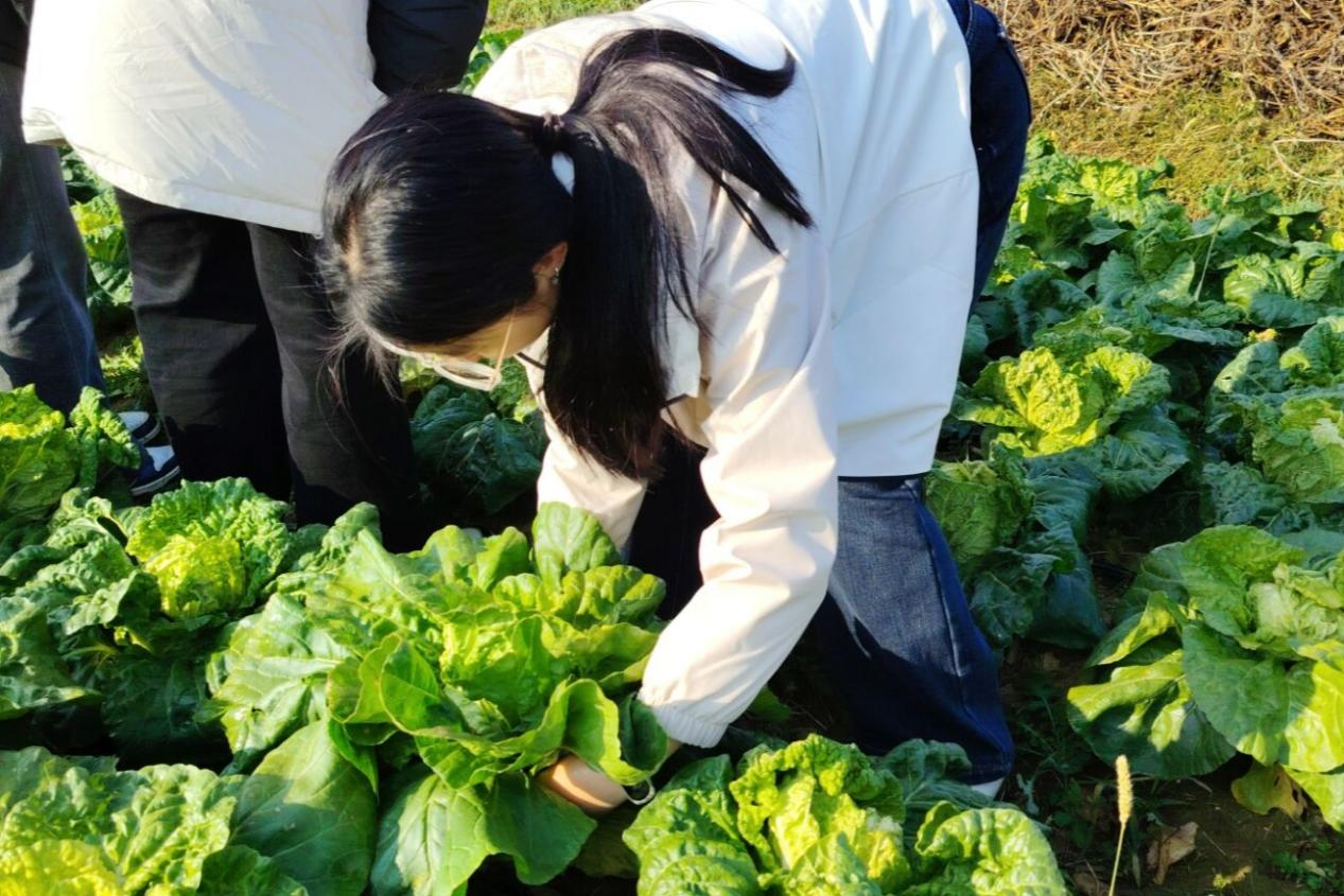 在农场负责人的热情指引下,同学们跃跃欲试地走进菜地,听从负责人“左右轻旋、顺势一拽”的秘诀动手采摘。翠绿的菜叶间,同学们的身影穿梭忙碌,伴随着清脆的拽拉声,一颗颗饱满的黄心白接连“出土”。大家用手机定格下沾满泥土气息的劳动瞬间,脸上洋溢着喜悦与满满的成就感。思想政治教育专业2025级(1)班范嘉琪表示“劳动教会我们要脚踏实地,用双手解决问题,而非空想;对于社会而言,每个人的劳动都是微小却重要的齿轮,无数人的劳动汇集起来,便是社会稳定运转、不断向前的动力。”