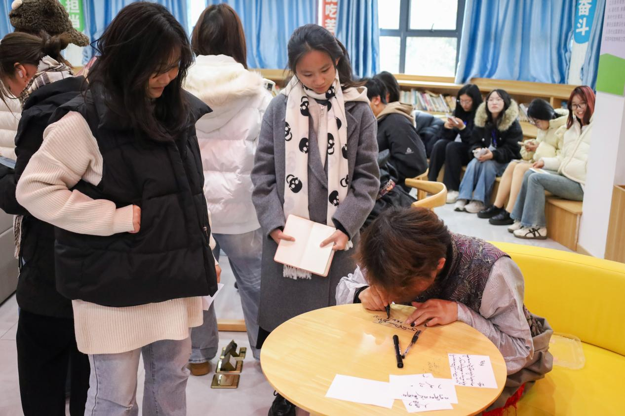 互动环节将现场气氛推向高潮。工作人员分发好书写纸片后,学生们纷纷围拢在藏族学生身边,请教藏文的写法。环境工程2024(2)班的吴攸拿着手里的纸牌翻看,纸牌一面是她的藏文名字,一面是藏文祝福,“这个写的是万事如意,䕒娃朗卓。”她指着字样补充,“下次再见到这个藏文词语,我就能认出来了。”