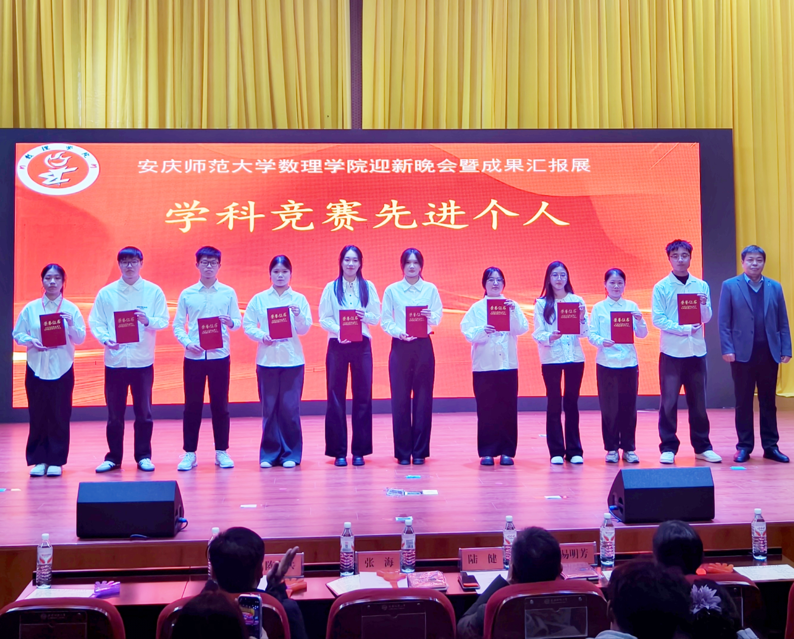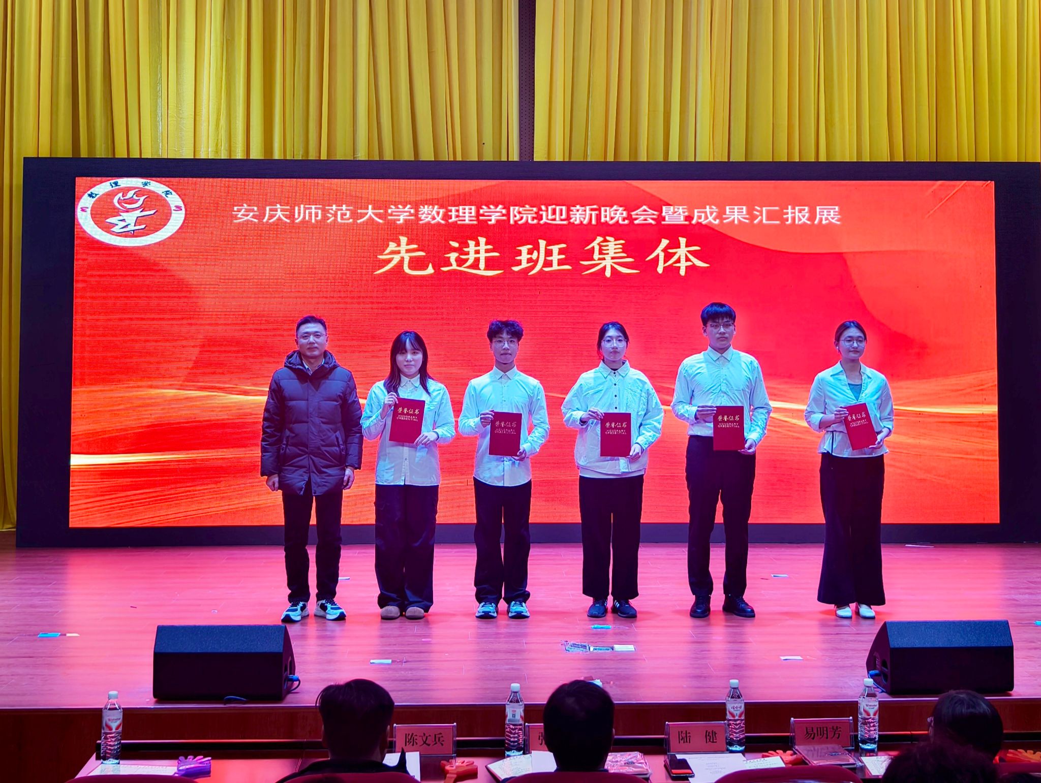 一年来,数理学院在集体建设、学科竞赛、学风营造及文体活动等方面全面发展,取得了丰硕的成果。为表彰先进,发挥榜样力量,晚会上对“优秀体育团队”“优秀团学骨干”“学科竞赛先进个人”“先进班集体”等先进集体与个人进行了表彰。
