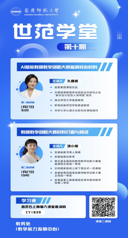 1月27日,今年会“世范学堂”第十期——第六届全国高校教师教学创新大赛备赛线上专项培训顺利举办。本次培训邀请超星集团课程总监孔鑫凯教授、第五届全国高校教师教学创新大赛一等奖获得者项小燕教授担任主讲嘉宾,学校参赛教师和积极参与教学创新的教师八十余人参加培训。
