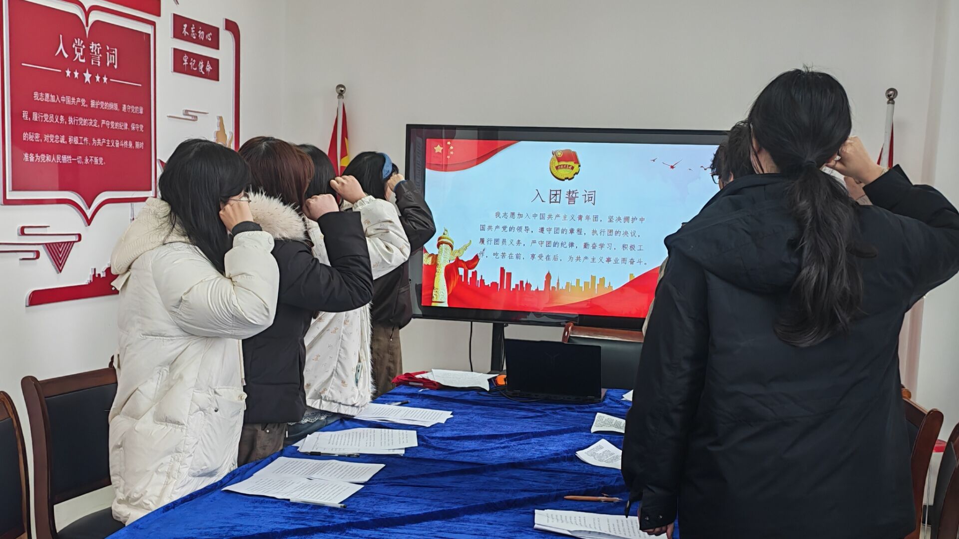会议最后,全体团员起立,齐唱《中国共产主义青年团团歌》,激昂的旋律凝聚起青春奋进的力量,让每一位团员在歌声中重温入团初心、感悟责任担当。随后,全体团员面向团旗,高举右拳,庄严重温入团誓词,铿锵有力的誓言回荡在会场,彰显了新时代青年团员听党话、跟党走的坚定决心。