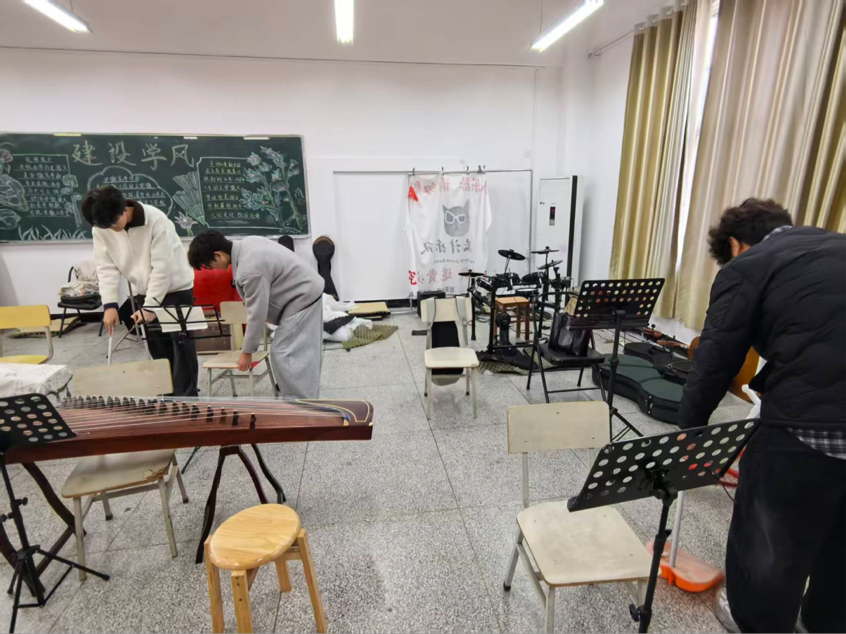 志愿者们分工协作、干劲十足,以饱满的热情投入到环境整治与美化工作中。在校园非机动车停放区,大家齐心协力,将杂乱停放的车辆逐一归位、整齐摆放,不仅改善了校园交通秩序,也消除了潜在安全隐患,提升了整体通行效率。在专业排练教室,志愿者们细心擦拭古筝、打击乐等乐器设备,规整课桌椅与乐谱架,清理卫生死角,使教学空间焕然一新,为师生营造了更加洁净、规范、舒适的艺术学习和创作环境。