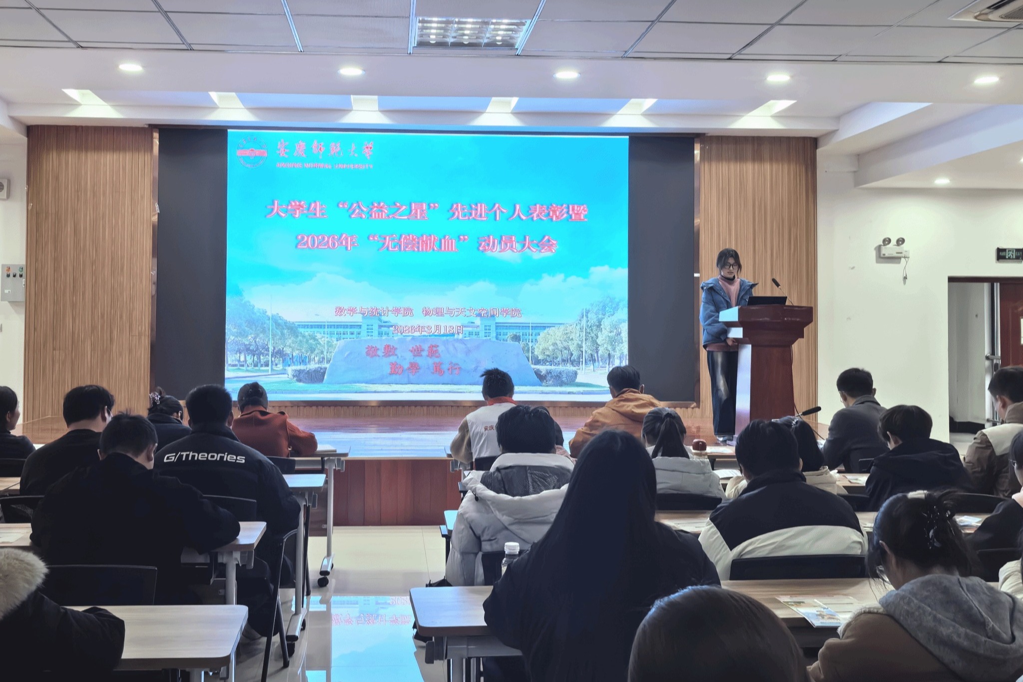 3月18日,数学与统计学院、物理与天文空间学院联合举办大学生“公益之星”先进个人表彰暨2026年“无偿献血”动员大会。学院党委负责人、辅导员、学生党支部书记、先进个人代表及学生党员、入党积极分子代表,市红十字中心血站工作人员参加会议。