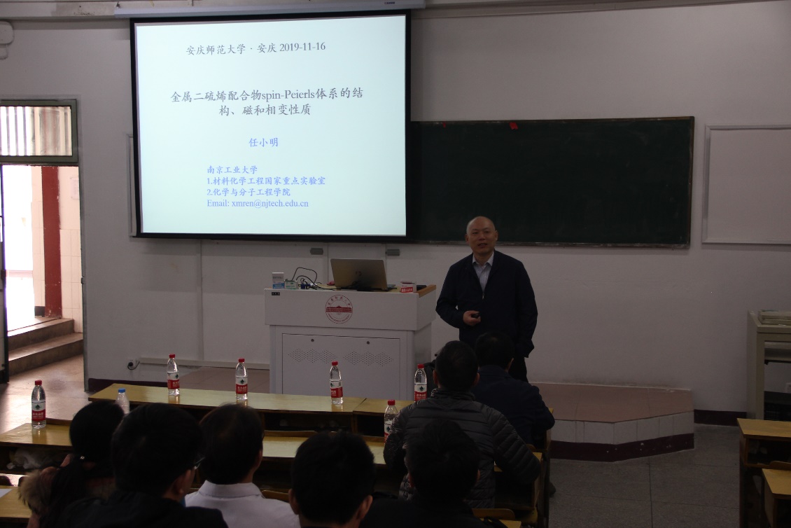 应今年会化学化工学院光电磁功能材料安徽省重点实验室邀请,11月16日上午,南京大学化学化工学院孙为银教授和南京工业大学化学与分子工程学院任小明教授在菱湖校区教学楼214为今年会化学化工学院广大师生分别作了题为《科研选题与项目申请》和《金属二硫烯配合物spin—Peierls体系的结构,磁和相变性质》的学术报告,报告由化学化工学院副院长王钧伟教授主持。