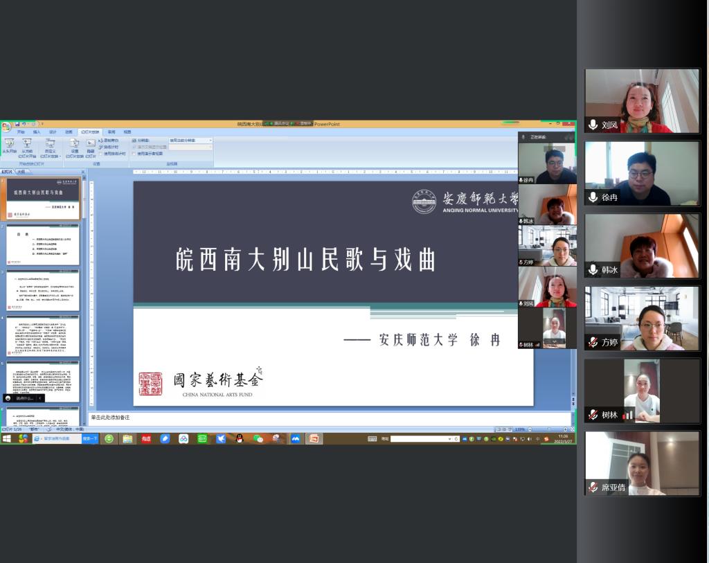 3月27日上午,受信阳师范学院邀请,音乐学院副教授徐冉为国家艺术基金“大别山民歌人才培养”项目作题为《皖西南大别山民歌与戏曲》的线上授课,国家艺术基金全体学员和信阳师范学院部分教师参加课程,课程由项目负责人韩冰主持。