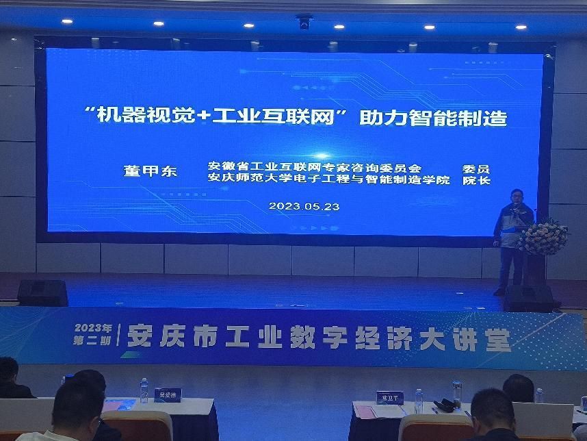 5月24日,2023年第二期全市工业数字经济大讲堂在安庆筑梦新区举办,电子工程与智能制造学院董甲东教授应邀作“机器视觉+工业互联网助力智能制造”专题报告。