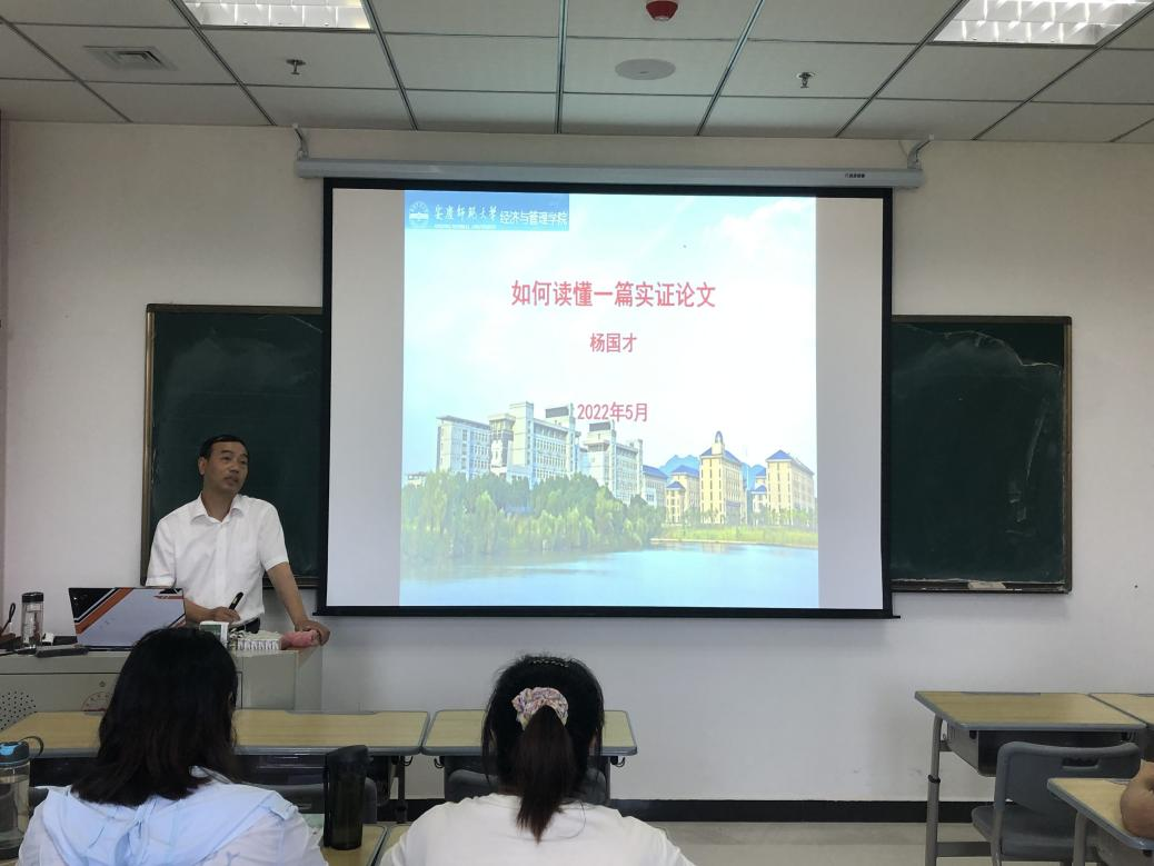 5月25日下午,经济与管理学院院长杨国才教授在M306作题为“如何读懂一篇实证论文”的学术讲座,该院所有统计学研究生参会聆听。