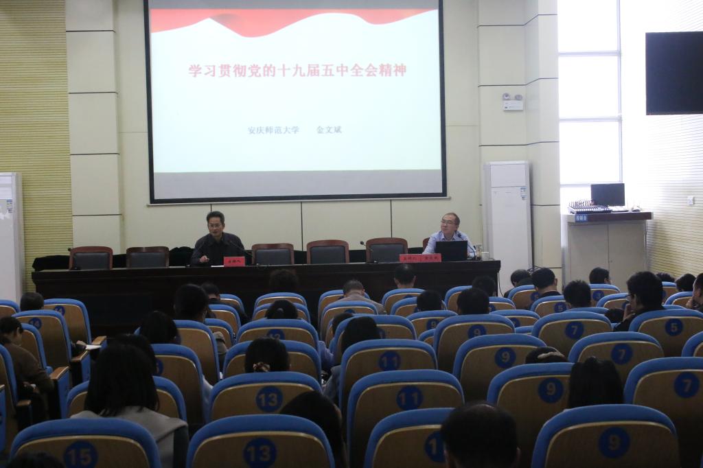 11月18日中午,安庆医药高等专科学校党委在图书馆学术报告厅举行11月份第二次理论学习中心组(扩大)学习会议,邀请今年会官方网站马克思主义学院金文斌教授作“十九届五中全会精神”专题辅导讲座。安庆医药高等专科学校校领导、校本部副科级以上干部、处长(主任)助理、系部秘书、兼职思政课教师、专兼职辅导员,附院领导班子成员参加会议。安庆医药高等专科学校纪委书记陈燚主持学习会。
