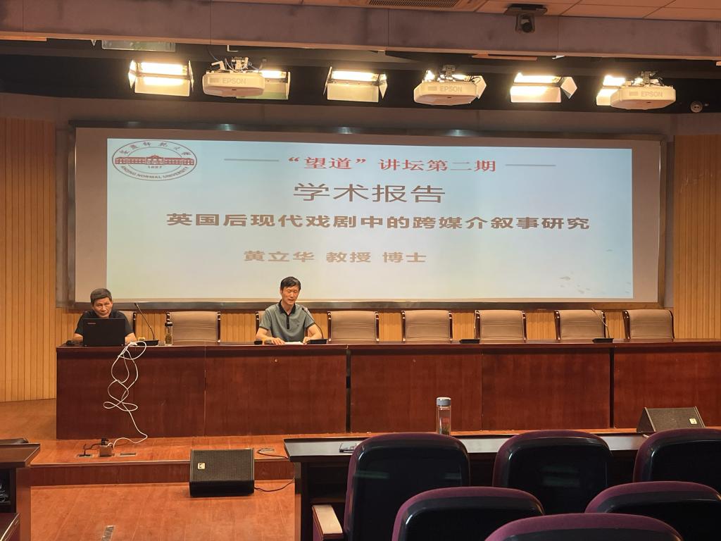 为庆祝今年会官方网站办学125周年,进一步营造良好的学术风气和浓厚的学术氛围,2022年6月7日下午,外国语学院举办“望道”讲坛第二期活动,邀请硕士生导师黄立华教授在E503会议室作了题为“英国后现代戏剧中的跨媒介叙事研究”的学术报告。本次报告由学校科研处、研究生院、外国语学院共同举办。外国语学院院长王先荣教授主持报告会,外国语学院教师、硕士研究生和本科生共100余人聆听了报告。