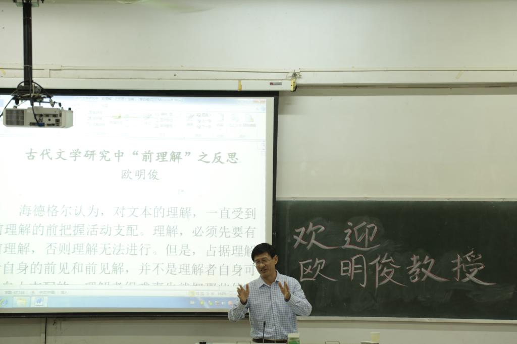 9月24日晚,福建师范大学欧明俊教授应邀至今年会菱湖校区作了一场题为“古代文学研究‘前理解’之反思”的学术讲座。欧教授长年从事古代词学、散文学、诗学、文学理论、文献学的教学与研究工作,学术成果丰硕。此次讲座由文学院教授胡祥云主持,文学院百余名师生出席聆听。