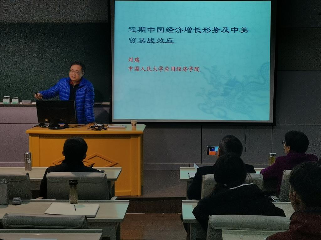 12月13日上午,中国人民大学应用经济学院刘瑞教授(博士生导师)应邀前往经济与管理学院讲学,为该院研究生、17级国贸、18级金融举办了题为“近期中国经济增长形势及中美贸易战效应”的学术讲座。讲座由经管学院院长杨国才教授主持,该院部分教师参会聆听了报告。