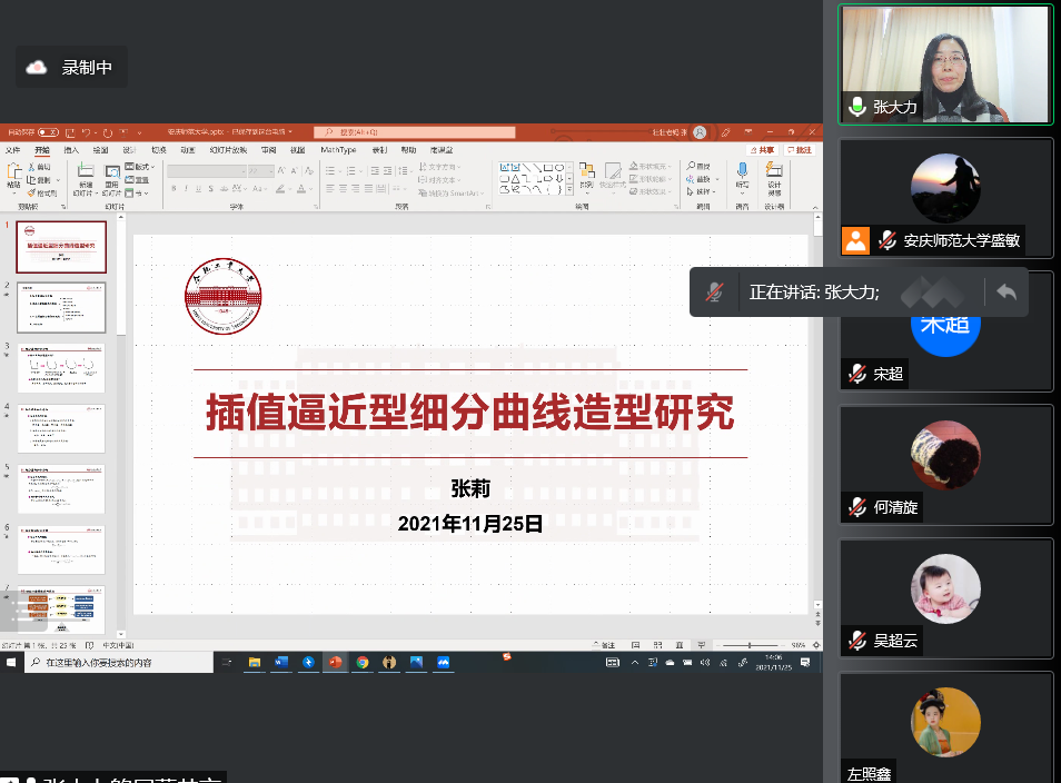 11月25日下午,合肥工业大学博士生导师张莉教授在线上作了一场题为“插值逼近型细分曲线造型研究”的学术报告。数理学院部分老师,数学一级学科硕士点研究生参加了会议。会议由数理学院盛敏教授主持。