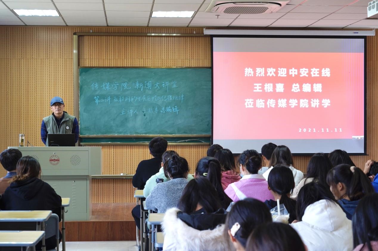 11月11日下午,中安在线总编辑王根喜在K518教室作了题为“互联网的传播历程与传播规律”的专题讲座,传媒学院2021级全体研究生和部分本科生共100人聆听了讲座。讲座由传媒学院副院长王业明主持。
