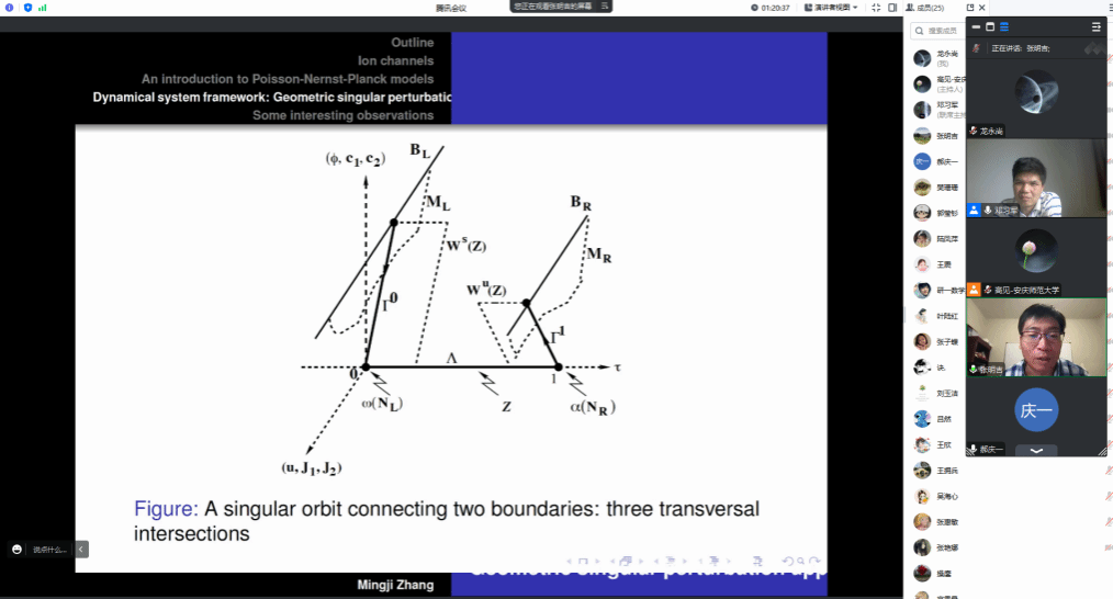 张教授系统阐述了离子通道的重要性及其生物学特性,介绍了如何通过无维的重新尺度化方法,将Poisson-Nernst-Planck模型转化为标准的奇异摄动问题;借助于几何奇异摄动理论,尤其是交换引理,详细分析了离子通过膜通道的内部动力学,特别指出边界条件,永久电荷,扩散系数和通道几何形状等因素对于离子通道中离子流的性质具有重要影响。