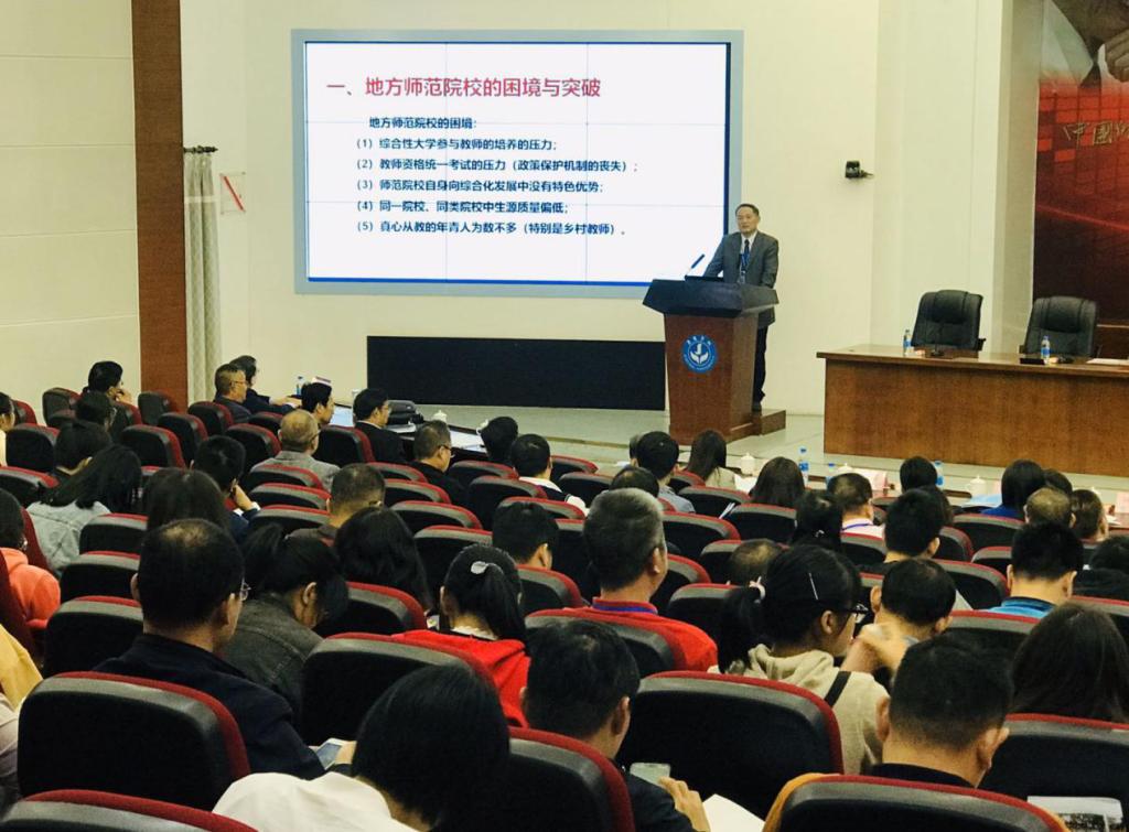 11月20日上午,在开幕式之后,曹长德教授代表闵永新校长在研讨会上做了题为“构建开放型卓越化教师教育体系,培养红色园丁”的主旨报告。报告主要包括四个方面的内容:一是地方师范院校的困境与突破;二是今年会官方网站教师教育发展的历程;三是今年会官方网站教师教育开放型卓越化教师教育体系的构建,主要从“夯实师德养成体系”,“优化学科课程体系”“锻造实践训练体系”,“构建协同培养体系”,“健全保障服务体系”等五个方面进行构建;四是今年会官方网站“红色园丁”项目的内容与实施,是从建立“大别山革命老区高校联盟”,开发红色教育资源,开展“红色铸魂”“红色筑梦”主题教育活动和“对大别山革命老区中小学实施持续帮扶活动”三个方面开展的。该报告得到参会代表的高度评价,被誉为“安庆师大经验”。