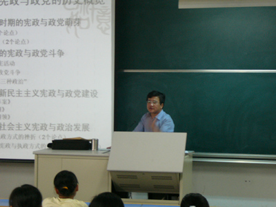 2007年5月9日下午2:30,安庆师范学院政法学院教授、北京大学政治学博士后、社会学博士后陶庆在龙山校区文溯楼403教室作了“弹指一挥间:百年宪政与百年政党”的学术讲座。来自政法学院思想政治教育专业和法学专业的100余名同学听取了报告。