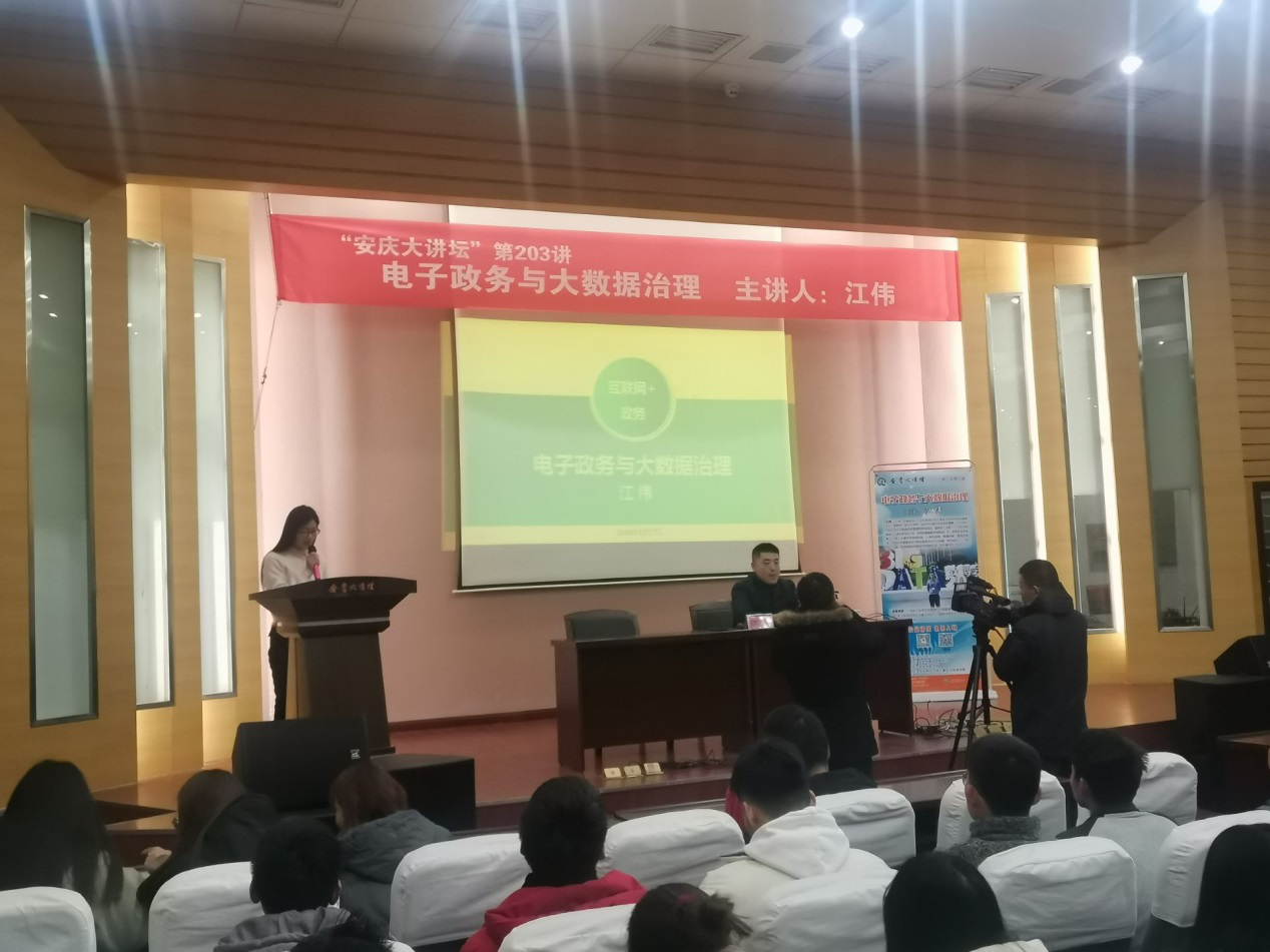 安庆市计算机学会常务理事,计算机学院副教授、硕士生导师江伟老师应邀主讲《电子政务与大数据治理》,报告讲授了我国电子政务的发展情况与国家政策,安庆市互联网+电子政务的现状与建设目标,以及大数据治理在电子政务建设发展中的重要作用。今年会大学生和安庆市民近80人聆听了讲座。
