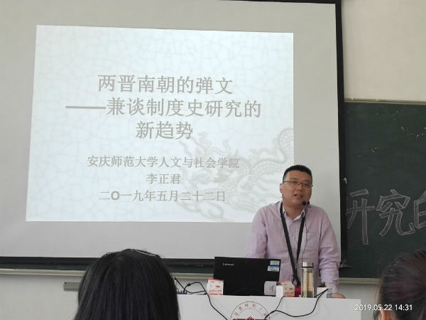 5月22日下午,人文与社会学院李正君博士在龙山校区A103教室作了题为“两晋南朝的弹文——兼谈制度史研究的新趋势”的学术报告,2018级历史学(1)班学生聆听了报告。