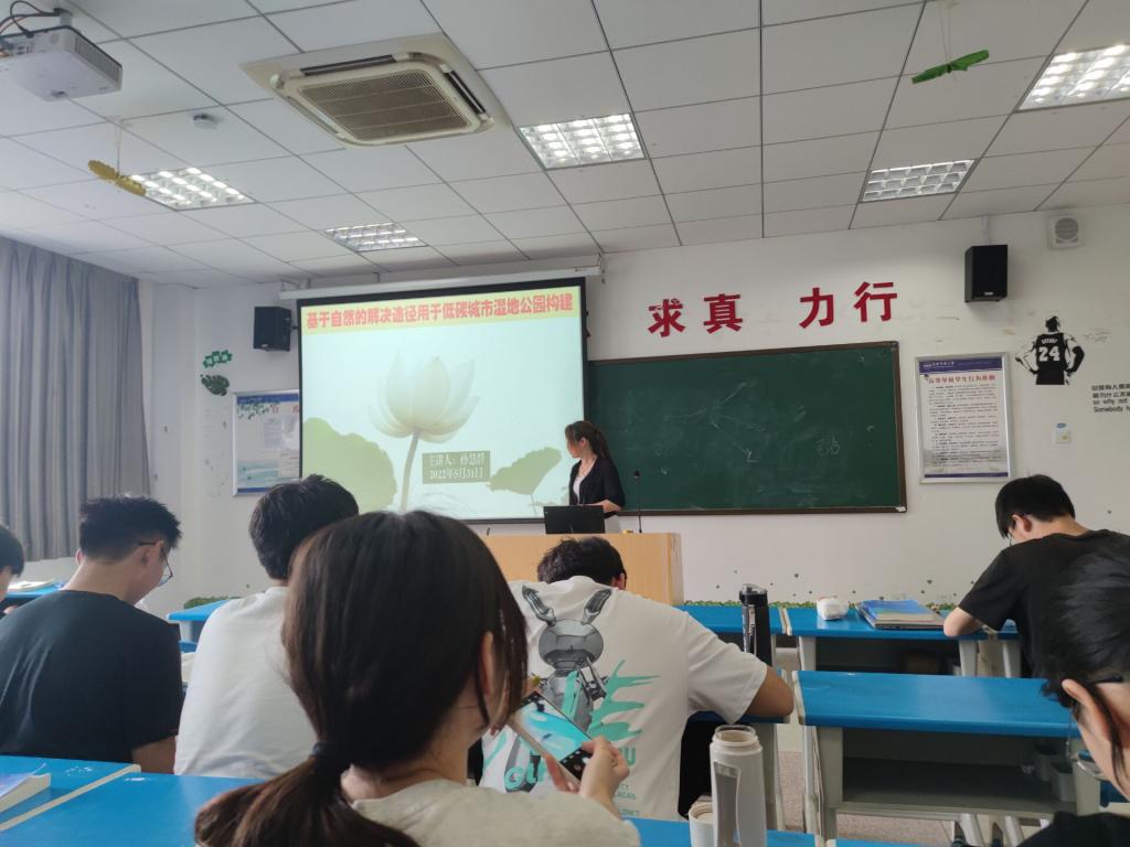 报告会上,孙慧群副教授首先介绍了“双碳”目标与低碳城市,对基于自然的解决途径研究进行了阐述。接着,她以安庆沙漠洲湿地为案例,讲解了基于NBS模式的生态修复用于湿地公园构建,重点阐述垂直流人工湿地塈植物组合修复技术,以及城市湿地公园经过生态修复可达到的碳汇减排效果,点明基于NBS模式的城市湿地公园生态修复与生态旅游融合一体对低碳城市建设和绿色发展的贡献。报告结束后,孙慧群副教授与同学们就湿地公园碳汇减排专业问题的进行了交流与讨论。