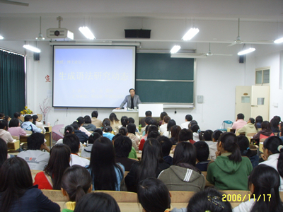 英语生成语法是英语语言学中一个前沿学术课题,张杰教授多年致力于英语生成语法的研究,并取得了可喜的成就,出版了学术专著《英语语言学要略》。张教授首先详细地介绍了英语生成语法的历史渊源,指出英语生成语法是由美国著名语言学家乔姆斯基提出的、一门新兴的英语语言学课题,其研究前景十分广阔。接着,他从英语生成语法发展的两个重要阶段,即原则与参数理论时期和标准理论时期,用图表的形式向同学们演示了生成语法的发展历程、实际运用以及已经取得的成就。张教授的报告列举了大量贴近大学生学习的实例,使得同学们对生成语法这一前沿课题有了较为细致的了解,激起了同学们对学术研究的兴趣。与会听众对张教授形象生动、幽默风趣的讲解不时地报以热烈的掌声。