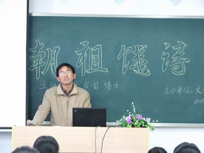 11月21日下午,文学院“博士教授论坛”在文源楼306教室正式开始,叶当前博士作了题为“论六朝祖饯诗”的学术报告。文学院文艺理论教研室全体教师以及汉语言文学专业05级100余名同学参加了此次论坛。