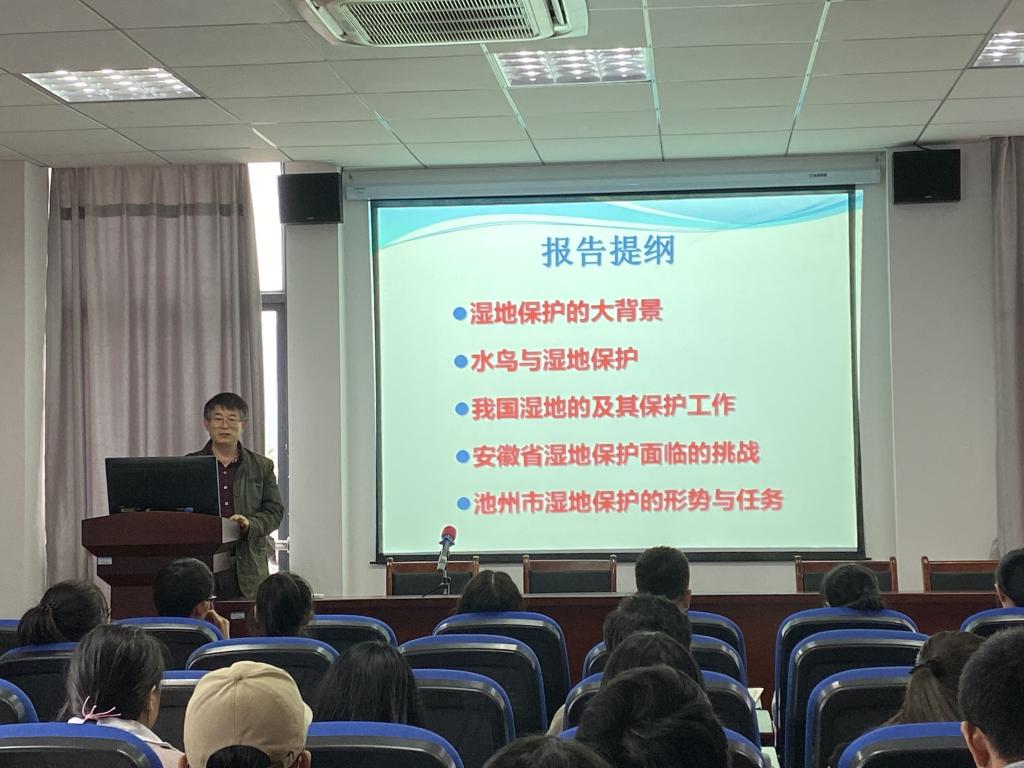 周立志教授就《安徽湿地保护修复模式的探索与实践》做了详细讲解。具体介绍了什么是湿地,湿地的类型和生态过程,湿地的重要性和保护,以及国际国内湿地保护大背景。报告还就安徽湿地的现状,深入探讨了安徽湿地保护面临的挑战和保护任务的艰巨性。报告结束后, 该院与会师生与周教授就湿地保护问题进行了探讨和交流。