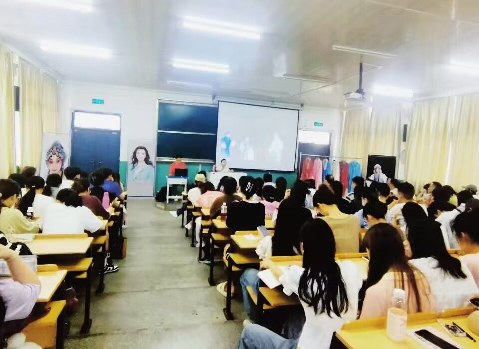 交流互动环节中,同学们踊跃上台,近距离感受名家风范并接受艺术家的现场指导。整场讲座理论讲解与现场示范相结合,并展示精美服饰与头面。讲座最后,曾昭娟用一段话总结自己的艺术人生:“我始终知道,我从哪里来,到哪里去,我为了谁,我属于谁,在我心里,舞台是一个神圣的地方,观众永远是我的衣食父母。我对舞台始终敬畏如初,从来没有因为自己在艺术上的成熟而有丝毫懈怠。一直到今天,每一次大幕拉开,都是我的朝圣之旅。”