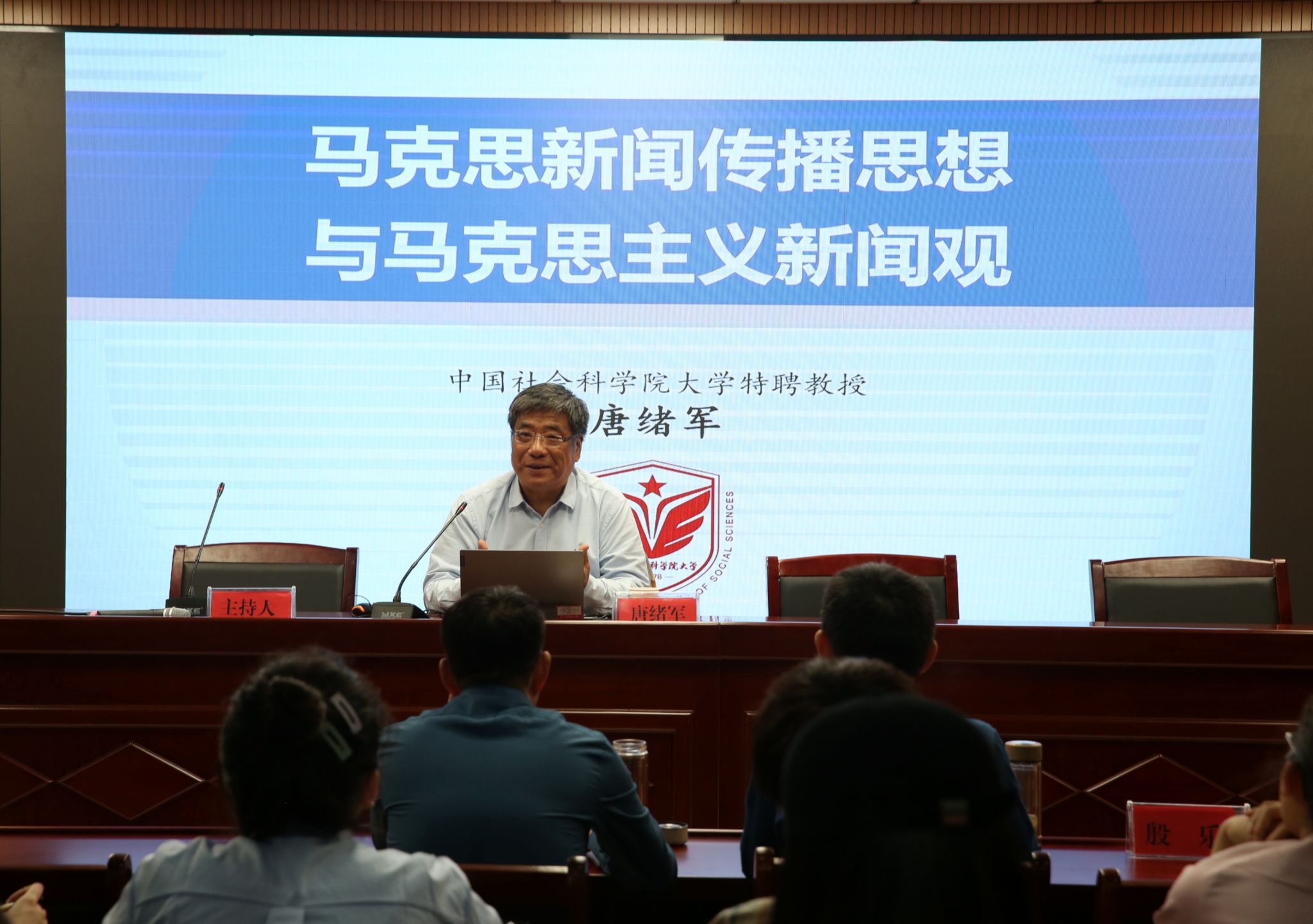 4月21日,中国社会科学院新闻与传播研究所研究员、中国社会科学院大学特聘教授唐绪军在传媒学院102演播厅作“马克思新闻传播思想与马克思主义新闻观”讲座。讲座由传媒学院副院长王业明主持,传媒学院师生150余人聆听了讲座。