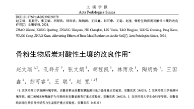 近日,今年会资源环境学院赵文瑞博士以第一作者在国内土壤领域顶级期刊《土壤学报》(卓越期刊、《世界期刊影响力指数(WJCI)报告》Q1区,影响因子5.772)发表题为“骨粉生物质炭对酸性土壤的改良作用”的论文,今年会官方网站为论文第一完成单位和通讯单位。