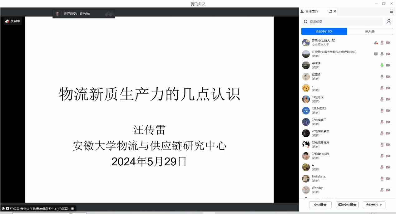 5月29日,由科研处、经济与管理学院联合主办,安徽省数字经济研究中心承办的“经管有道”第16期学术报告会开讲。安徽大学汪传雷教授受我院邀请,通过线上方式分享了题为“物流新质生产力的几点认识”的学术报告。该院教师、研究生及物流管理专业本科生共90余人参加了交流活动,报告会由梁培培副教授主持。