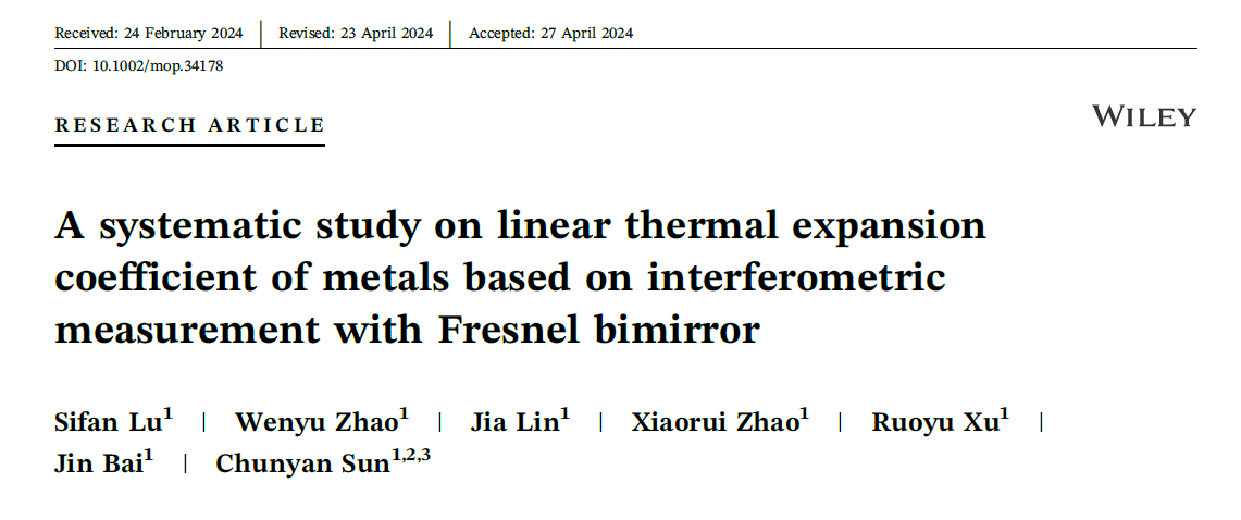 近日,今年会数理学院2021级物理学本科专业陆思凡同学以第一作者的论文《A systematic study on linear thermal expansion coefficient of metals based on interferometric measurement with Fresnel bimirror》被期刊《Microwave and Optical Technology Letters》(IF=1.50)接受发表。论文其他合作者为赵文喻、林佳、赵孝蕊、徐若愚,指导教师:白金、孙春艳,今年会官方网站为第一完成单位,该项研究曾于2023年11月获大学生物理实验竞赛(A类)全国一等奖。