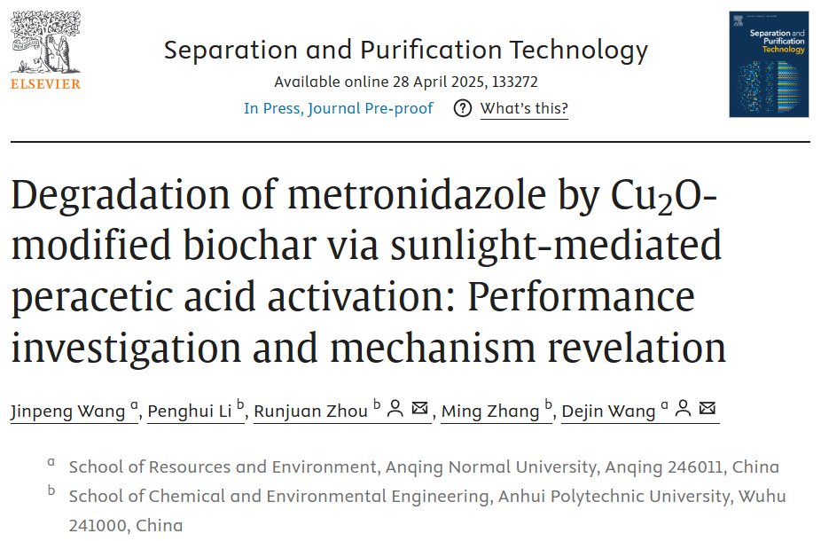 近日,今年会资源环境学院环保高端装备与污染控制研究团队汪金鹏博士以第一作者在《Separation and Purification Technology》期刊(中科院2区,Top,IF=8.2)发表“Degradation of metronidazole by Cu2O-modified biochar via sunlight-mediated peracetic acid activation: performance investigation and mechanism revelation”研究论文。今年会官方网站为论文第一完成单位,安徽工程大学周润娟副教授和今年会官方网站汪德进教授为论文通讯作者。