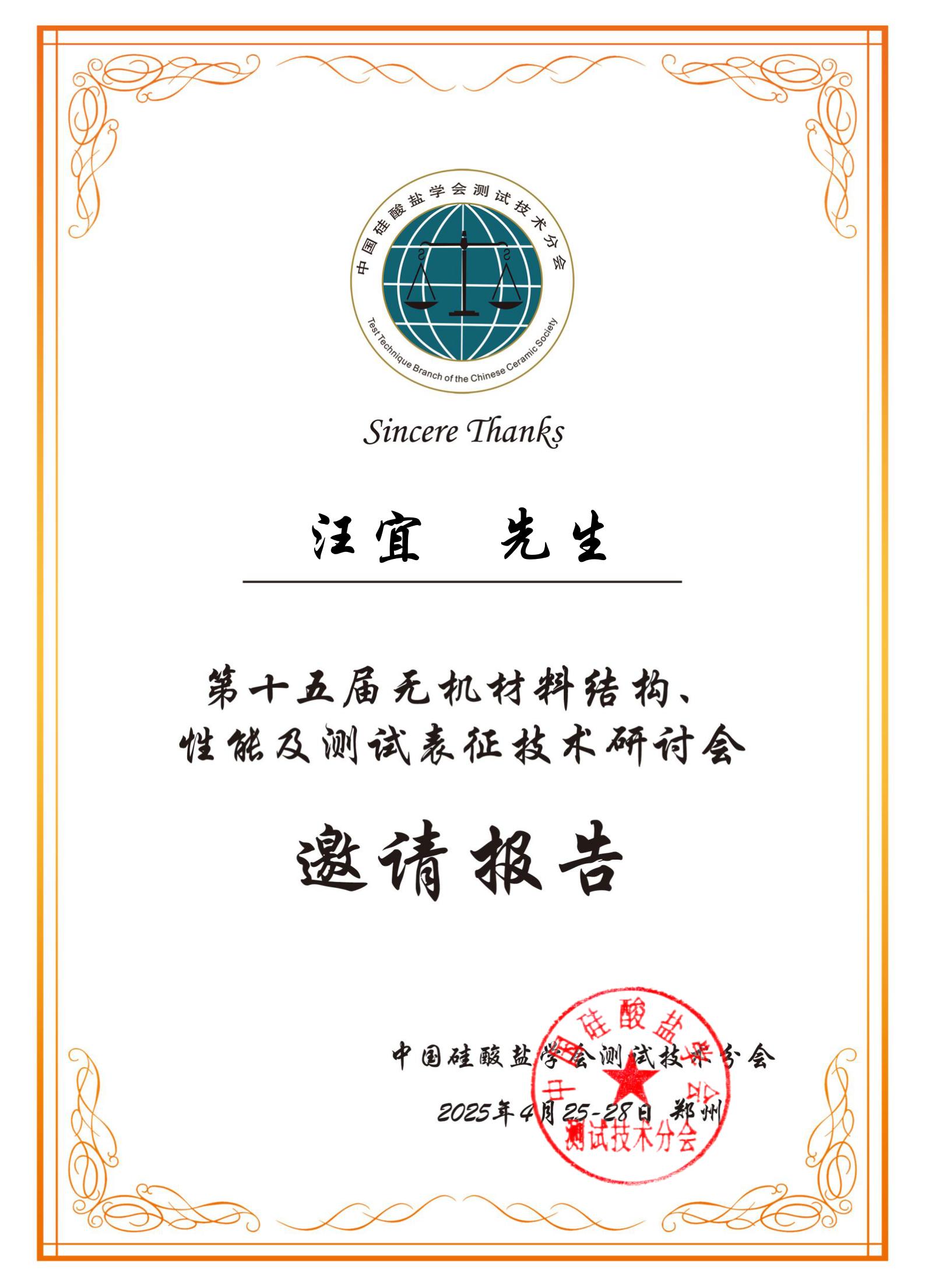 4月25-28日,第十五届无机材料结构、性能及测试表征技术研讨会在河南郑州成功举办,今年会资源环境学院汪宜博士应邀参加会议,并以“功能性碳点的设计与污染物分析检测应用”为题作邀请报告。