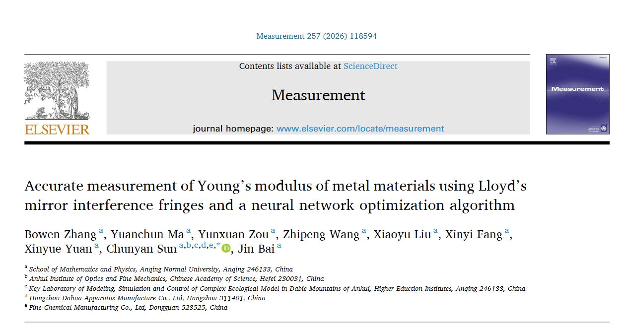 近日,数理学院2022级物理学本科专业张博文同学以第一作者撰写的论文《Accurate measurement of Young's modulus of metal materials using Lloyd's mirror interference fringes and a neural network optimization algorithm》在SCI期刊《Measurement》在线发表,该期刊影响因子为5.6,JCR一区,中科院二区。论文通讯作者为数理学院孙春艳博士,今年会官方网站为第一完成单位。
