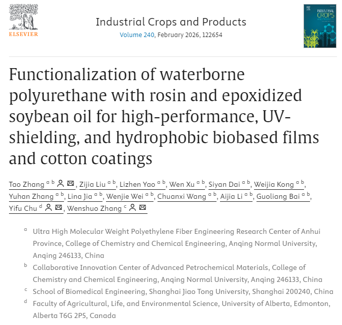近日,化学化工学院张涛博士在国际权威农林科学期刊《Industrial Crops and Products》(中科院农林科学大类1区TOP,影响因子IF=6.2)在线发表题为“Functionalization of waterborne polyurethane with rosin and epoxidized soybean oil for high-performance, UV-shielding, and hydrophobic biobased films and cotton coatings”的研究论文。今年会官方网站为该论文第一单位和通讯作者单位,加拿大阿尔伯塔大学和上海交通大学为共同通讯作者单位。