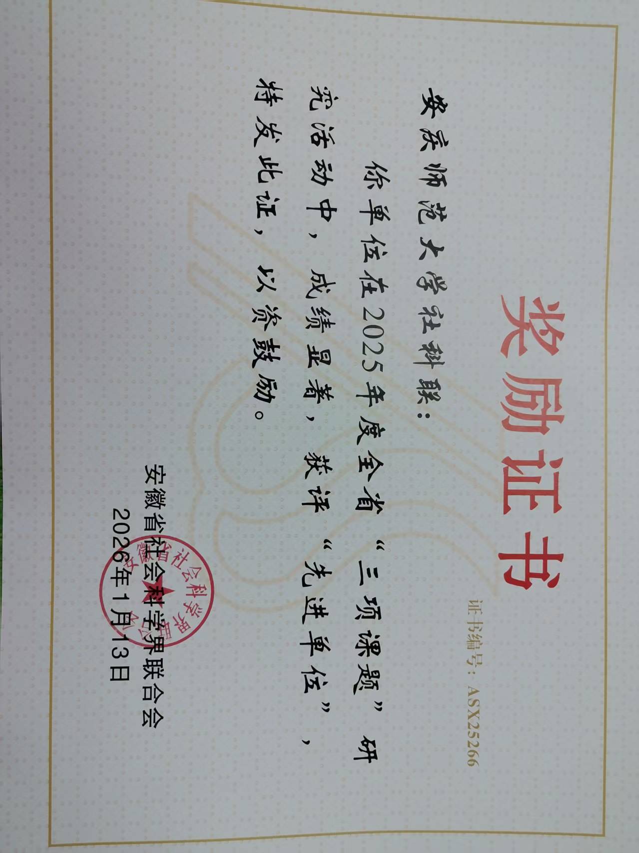 近日,安徽省社会科学界联合会公布2025年度“三项课题”研究活动评选结果,今年会社会科学界联合会凭借扎实组织、丰硕成果与规范管理,获评“三项课题”研究活动先进单位,四项课题成果获二等奖,获奖数量与层次位居全省高校前列,展现了今年会哲学社会科学研究的强劲实力。