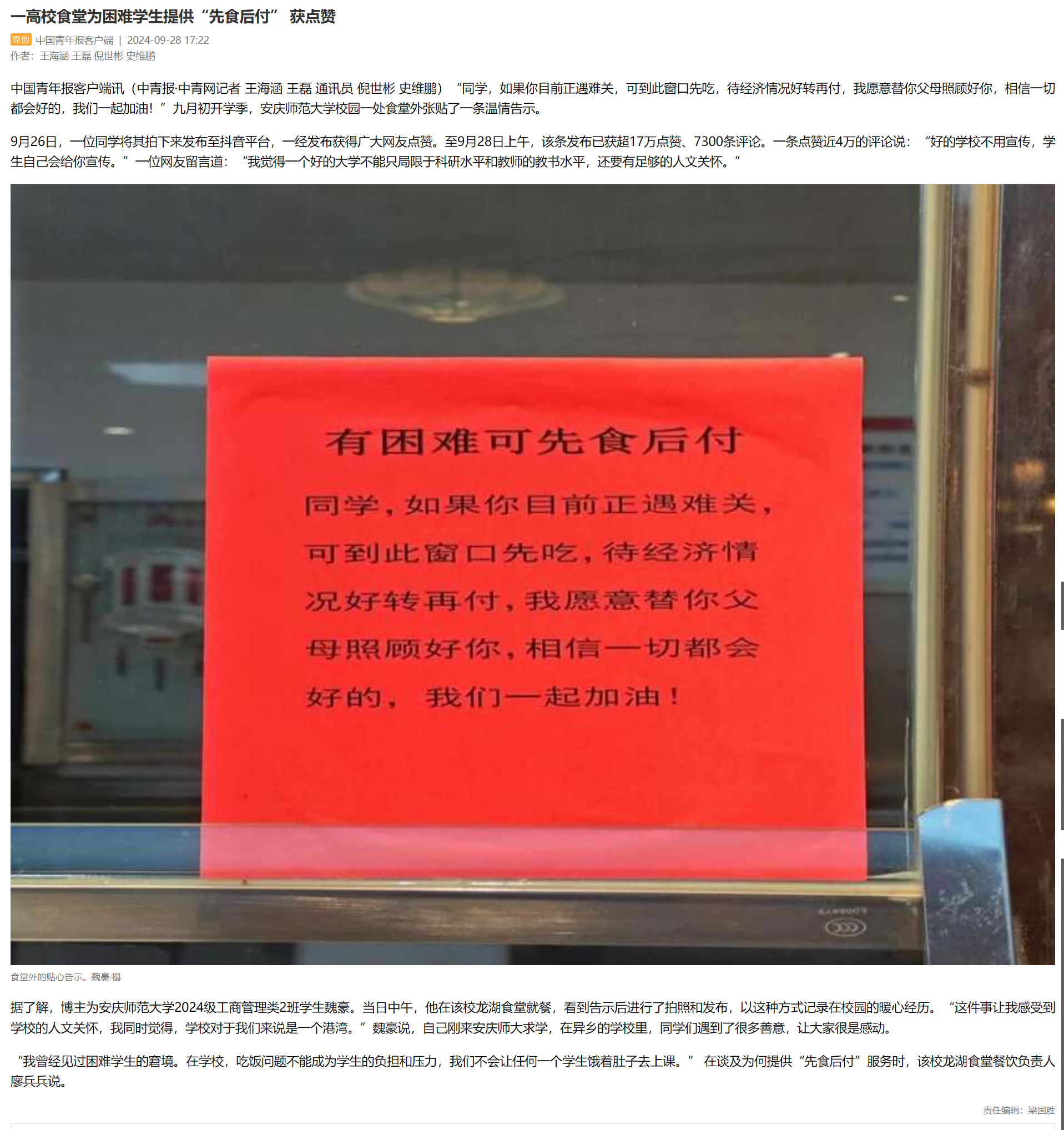 下一篇:羊城晚报:困难学生“先食后付”,大学可以多一些这样的人性化措施丨时评