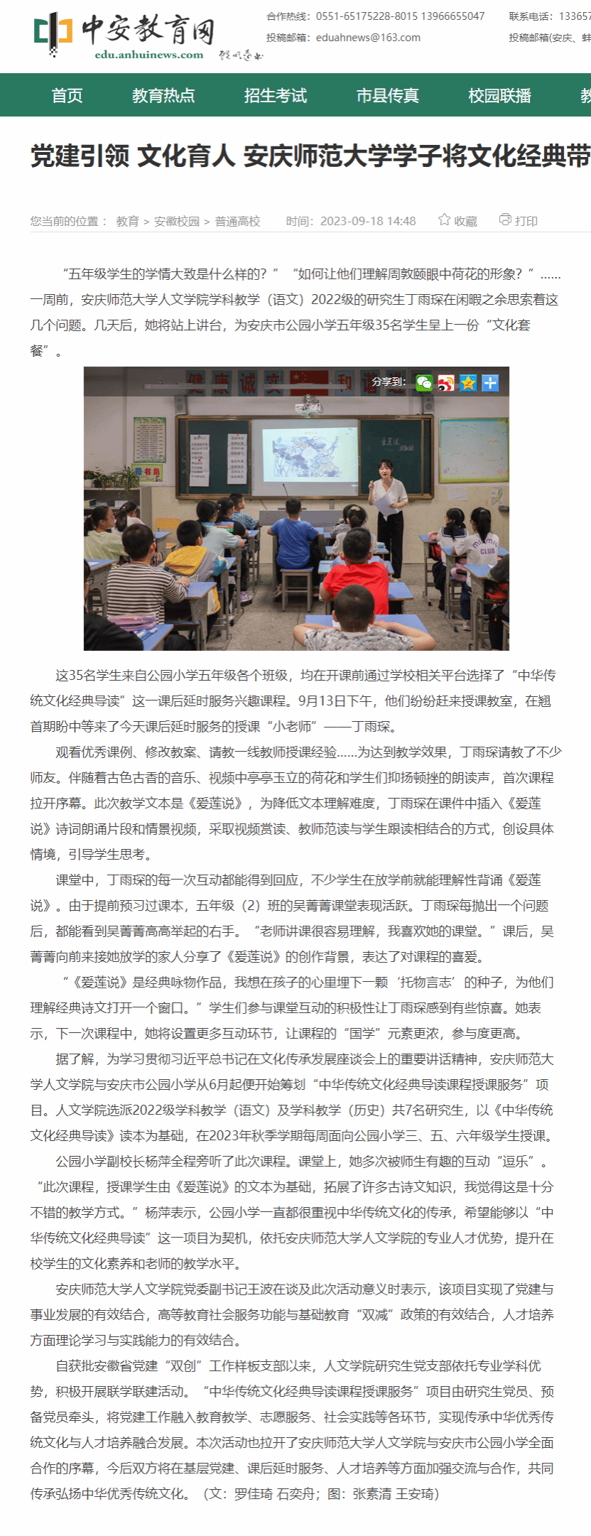 上一篇:中国教育在线:党建引领 文化育人 安庆师大学子将文化经典带入小学校园