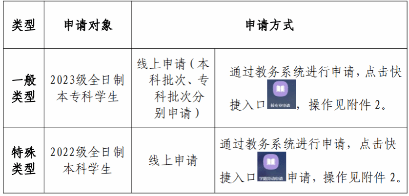 转专业分为一般类型和特殊类型集中组织,申请对象及方式如下: