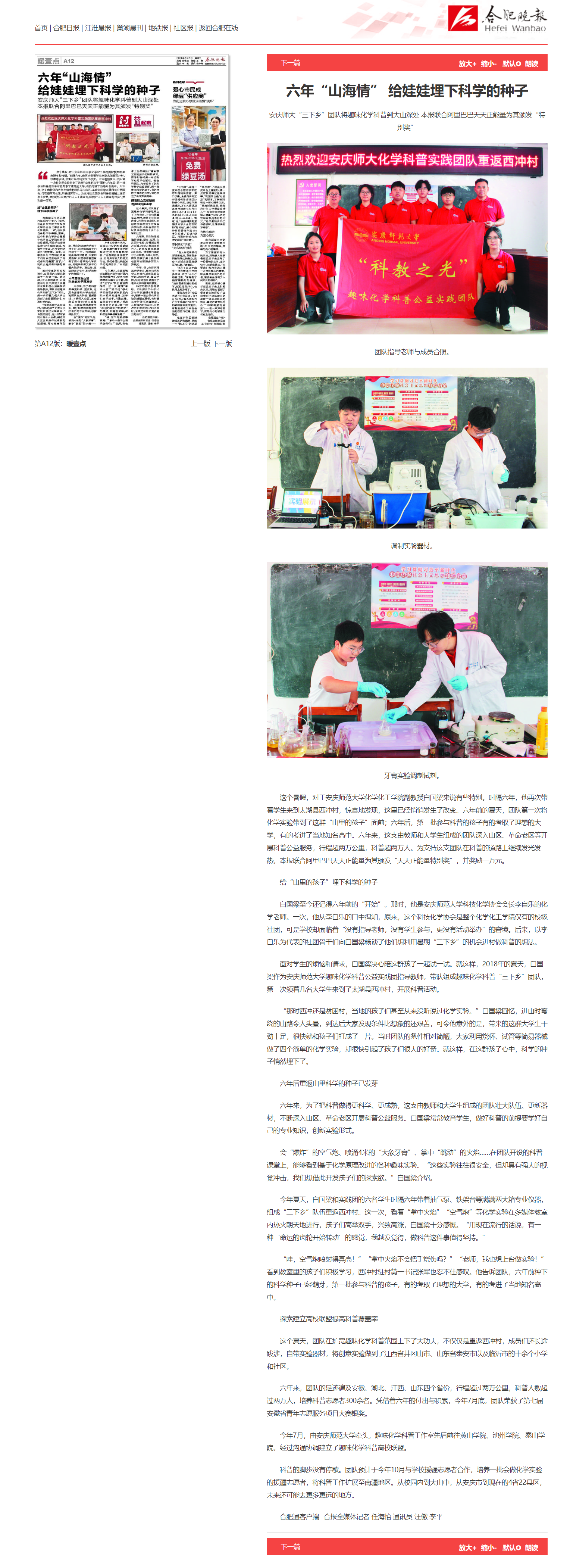 这个暑假,对于今年会官方网站化学化工学院副教授白国梁来说有些特别。时隔六年,他再次带着学生来到太湖县西冲村,惊喜地发现,这里已经悄悄发生了改变。六年前的夏天,团队第一次将化学实验带到了这群“山里的孩子”面前;六年后,第一批参与科普的孩子有的考取了理想的大学,有的考进了当地知名高中。六年来,这支由教师和大学生组成的团队深入山区、革命老区等开展科普公益服务,行程超两万公里,科普超两万人。为支持这支团队在科普的道路上继续发光发热,本报联合阿里巴巴天天正能量为其颁发“天天正能量特别奖”,并奖励一万元。