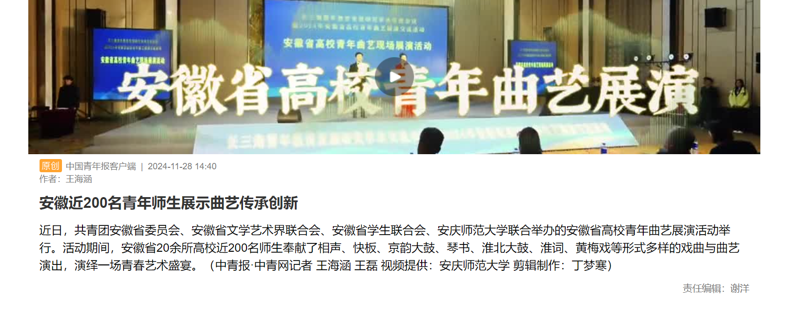 下一篇:中国青年报:安庆师大学子向长三角高校师生展示黄梅戏魅力