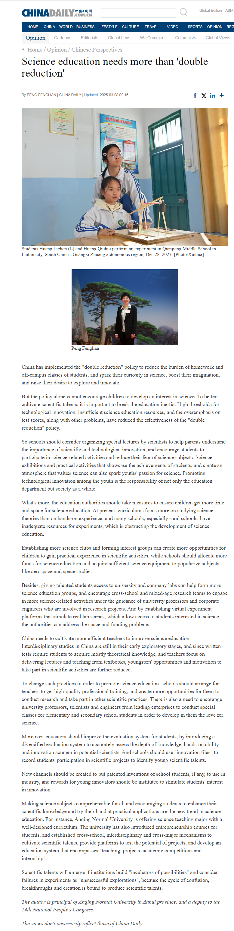 下一篇:中国日报网:代表委员说|彭凤莲:培养青少年创新能力不能只靠“双减”