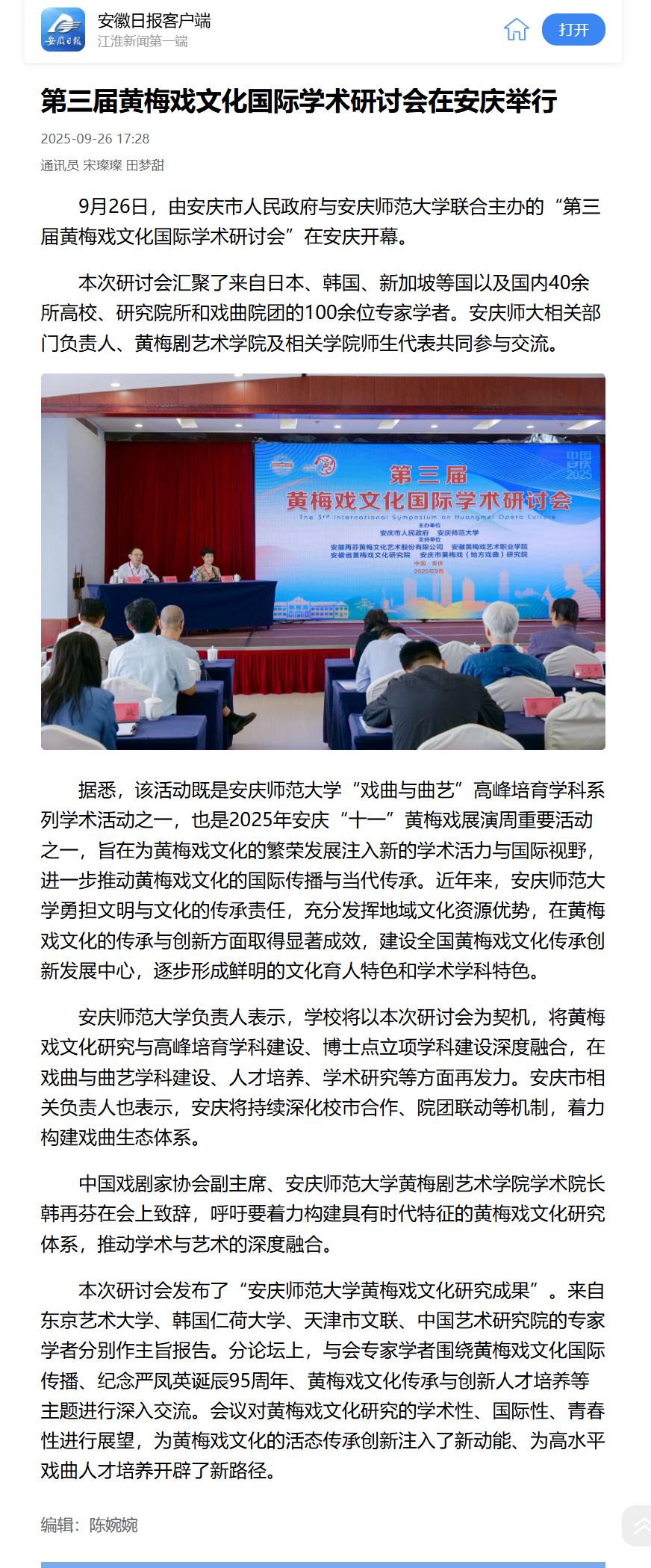 【安徽日报】第三届黄梅戏文化国际学术研讨会在安庆举行https://app.ahnews.com.cn/displayTemplate/news/newsDetail/253/1564381.html?isShare=true